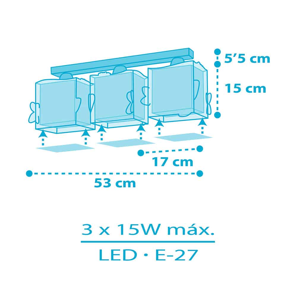 Τρίφωτο παιδικό φωτιστικό οροφής σε διάταξη ράγας κατάλληλο για γενικό φωτισμό και θέμα τους καρχαρίες. Κατασκευασμένο με καπέλα διπλού τοιχώματος από άκαυστο λεπτό πολυπροπυλένιο και φωσφορίζοντα στο σκοτάδι εξωτερικά μέρη. Παρέχεται διαχυτής φωτός για τις μικρότερες ηλικίες προσφέροντας ομοιόμορφο φωτισμό αλλά και προστασία στα μάτια. Κιτ ανάρτησης σε σχήμα ράγας και εύκολο τρόπο στήριξης. Τύπος ντουί E27 με θέσεις για τρεις λαμπτήρες LED για άπλετο φως στο δωμάτιο. Κατασκευασμένο εξ ολοκλήρου στην Ευρώπη το Little Shark τρίφωτο οροφής ράγας, συμπληρώνει τα υπόλοιπα παιδικά φωτιστικά της συλλογής κομοδίνου, απλίκα ή νυκτός.