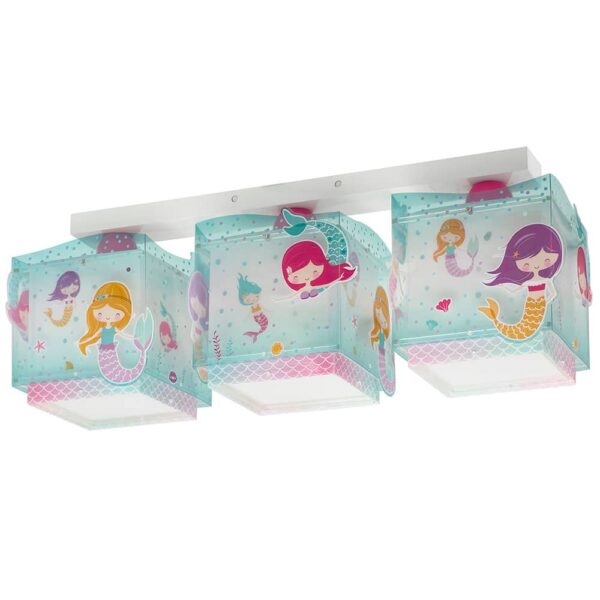 Τρίφωτο παιδικό φωτιστικό οροφής σε διάταξη ράγας κατάλληλο για γενικό φωτισμό και θέμα τις γοργόνες. Κατασκευασμένο με καπέλα διπλού τοιχώματος από άκαυστο λεπτό πολυπροπυλένιο και φωσφορίζοντα στο σκοτάδι εξωτερικά μέρη. Παρέχονται 3 διαχυτές φωτός για τις μικρότερες ηλικίες προσφέροντας ομοιόμορφο φωτισμό αλλά και προστασία στα μάτια. Κιτ ανάρτησης σε σχήμα ράγας και εύκολο τρόπο στήριξης. Τύπος ντουί E27 με θέσεις για τρεις λαμπτήρες LED για άπλετο φως στο δωμάτιο. Κατασκευασμένο εξ ολοκλήρου στην Ευρώπη το Mermaids τρίφωτο οροφής ράγας, συμπληρώνει τα υπόλοιπα παιδικά φωτιστικά της συλλογής κομοδίνου, απλίκα ή νυκτός.