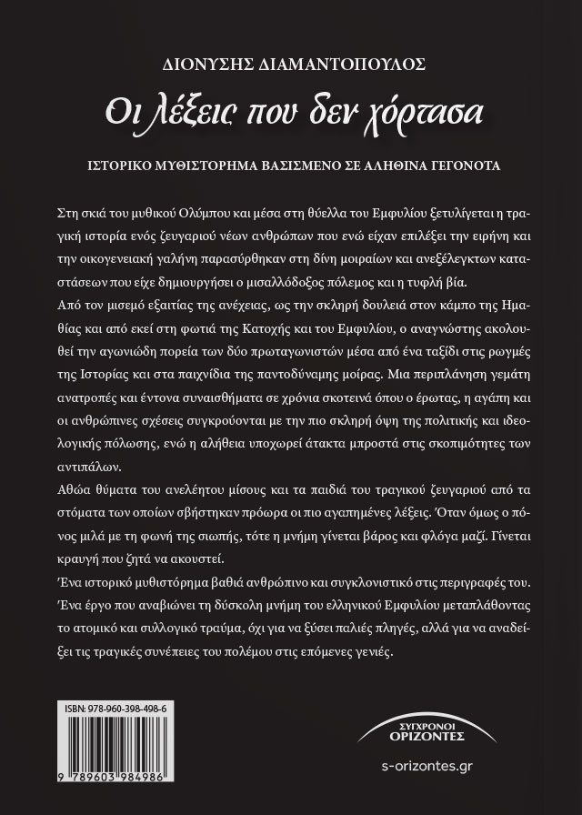 Στη σκιά του μυθικού Ολύμπου και μέσα στη θύελλα του Εμφυλίου ξετυλίγεται η τραγική ιστορία ενός ζευγαριού νέων ανθρώπων που ενώ είχαν επιλέξει την ειρήνη και την οικογενειακή γαλήνη παρασύρθηκαν στη δίνη μοιραίων και ανεξέλεγκτων καταστάσεων που είχε δημιουργήσει ο μισαλλόδοξος πόλεμος και η τυφλή βία. Από τον μισεμό εξαιτίας της ανέχειας, ως την σκληρή δουλειά στον κάμπο της Ημαθίας και από εκεί στη φωτιά της Κατοχής και του Εμφυλίου, ο αναγνώστης ακολουθεί την αγωνιώδη πορεία των δύο πρωταγωνιστών μέσα από ένα ταξίδι στις ρωγμές της Ιστορίας και στα παιχνίδια της παντοδύναμης μοίρας. Μια περιπλάνηση γεμάτη ανατροπές και έντονα συναισθήματα σε χρόνια σκοτεινά όπου ο έρωτας, η αγάπη και οι ανθρώπινες σχέσεις συγκρούονται με την πιο σκληρή όψη της πολιτικής και ιδεολογικής πόλωσης, ενώ η αλήθεια υποχωρεί άτακτα μπροστά στις σκοπιμότητες των αντιπάλων. Αθώα θύματα του ανελέητου μίσους και τα παιδιά του τραγικού ζευγαριού από τα στόματα των οποίων σβήστηκαν πρόωρα οι πιο αγαπημένες λέξεις. Όταν όμως ο πόνος μιλά με τη φωνή της σιωπής, τότε η μνήμη γίνεται βάρος και φλόγα μαζί. Γίνεται κραυγή που ζητά να ακουστεί. Ένα ιστορικό μυθιστόρημα βαθιά ανθρώπινο και συγκλονιστικό στις περιγραφές του. Ένα έργο που αναβιώνει τη δύσκολη μνήμη του ελληνικού Εμφυλίου μεταπλάθοντας το ατομικό και συλλογικό τραύμα, όχι για να ξύσει παλιές πληγές, αλλά για να αναδείξει τις τραγικές συνέπειες του πολέμου στις επόμενες γενιές.