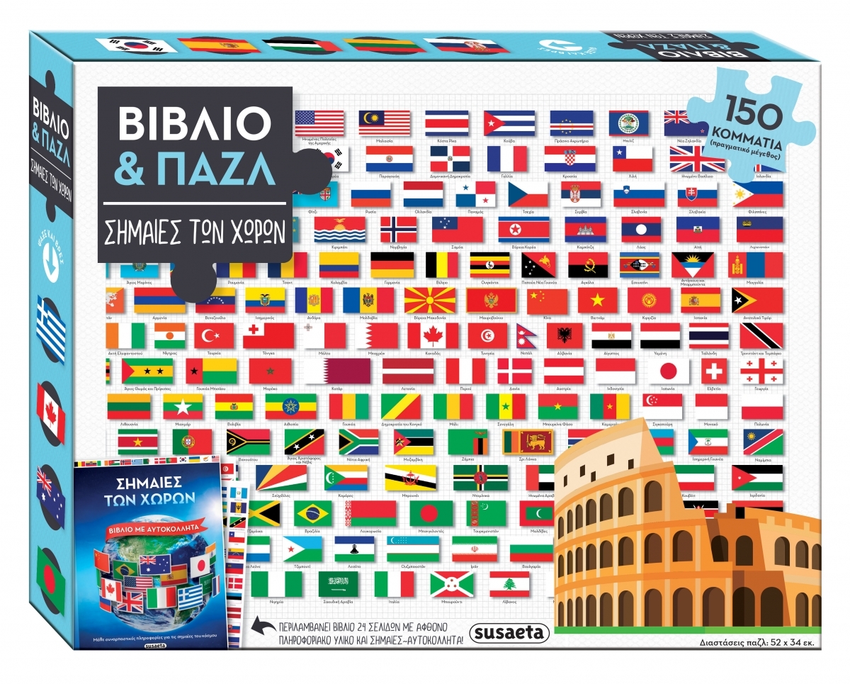 Πόσες σημαίες του κόσμου μπορείς να ονομάσεις; Ήρθε η ώρα να γνωρίσεις τις σημαίες των χωρών του κόσμου! Ανακάλυψέ τες όλες μέσα από αυτό το διασκεδαστικό παζλ των 150 κομματιών! Ένωσε τα κομμάτια για να φτιάξεις τις σημαίες δεκάδων χωρών και διάβασε πολλές ενδιαφέρουσες πληροφορίες για την ιστορία τους στο βιβλίο που συνοδεύει το παζλ. Εκεί θα βρεις και γεωφυσικούς χάρτες με όλες τις χώρες της Γης, για να απολαύσεις μια εντυπωσιακή περιήγηση στον πλανήτη μας!